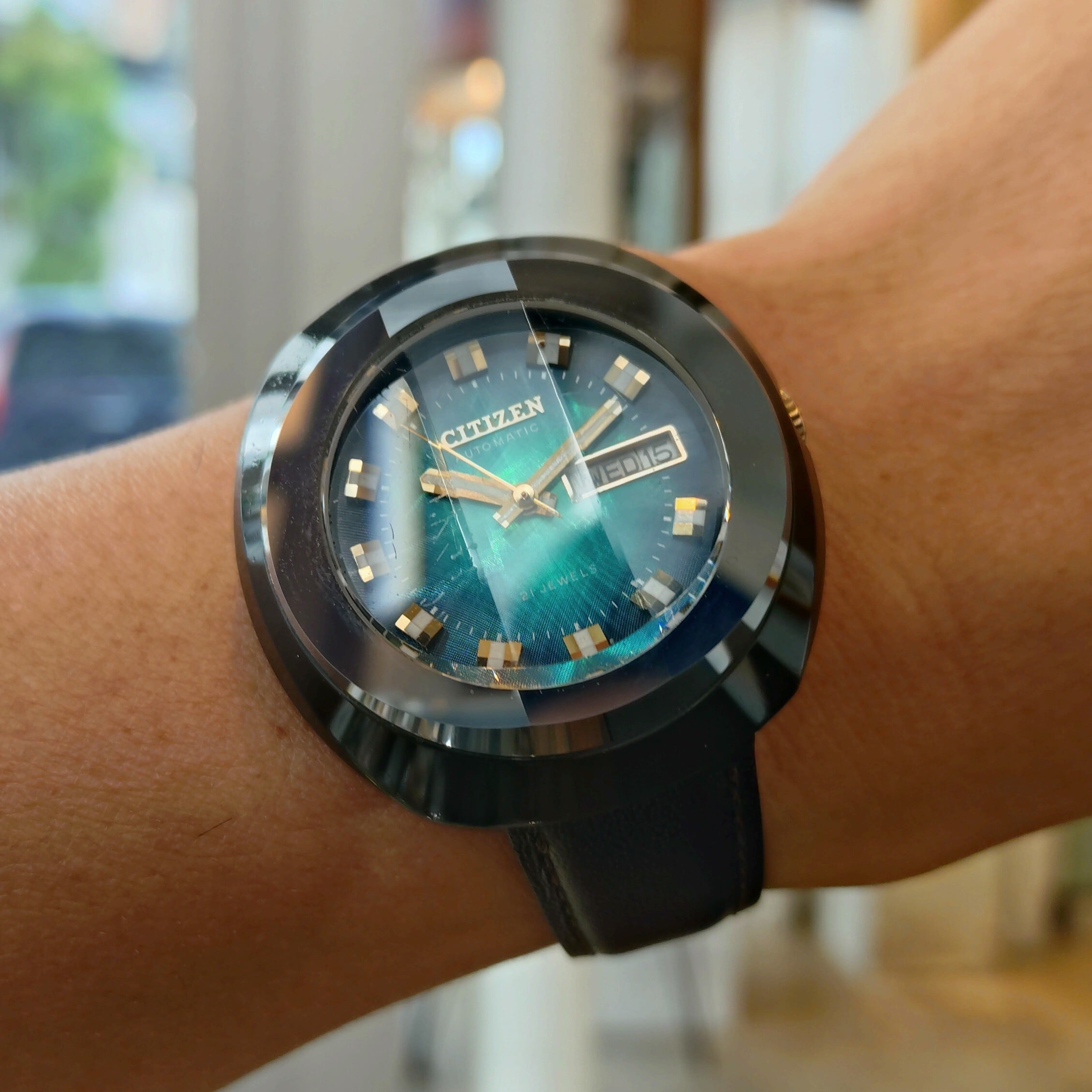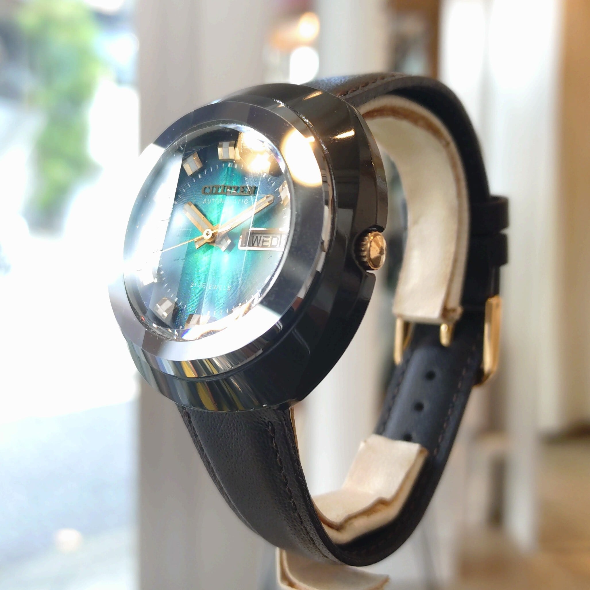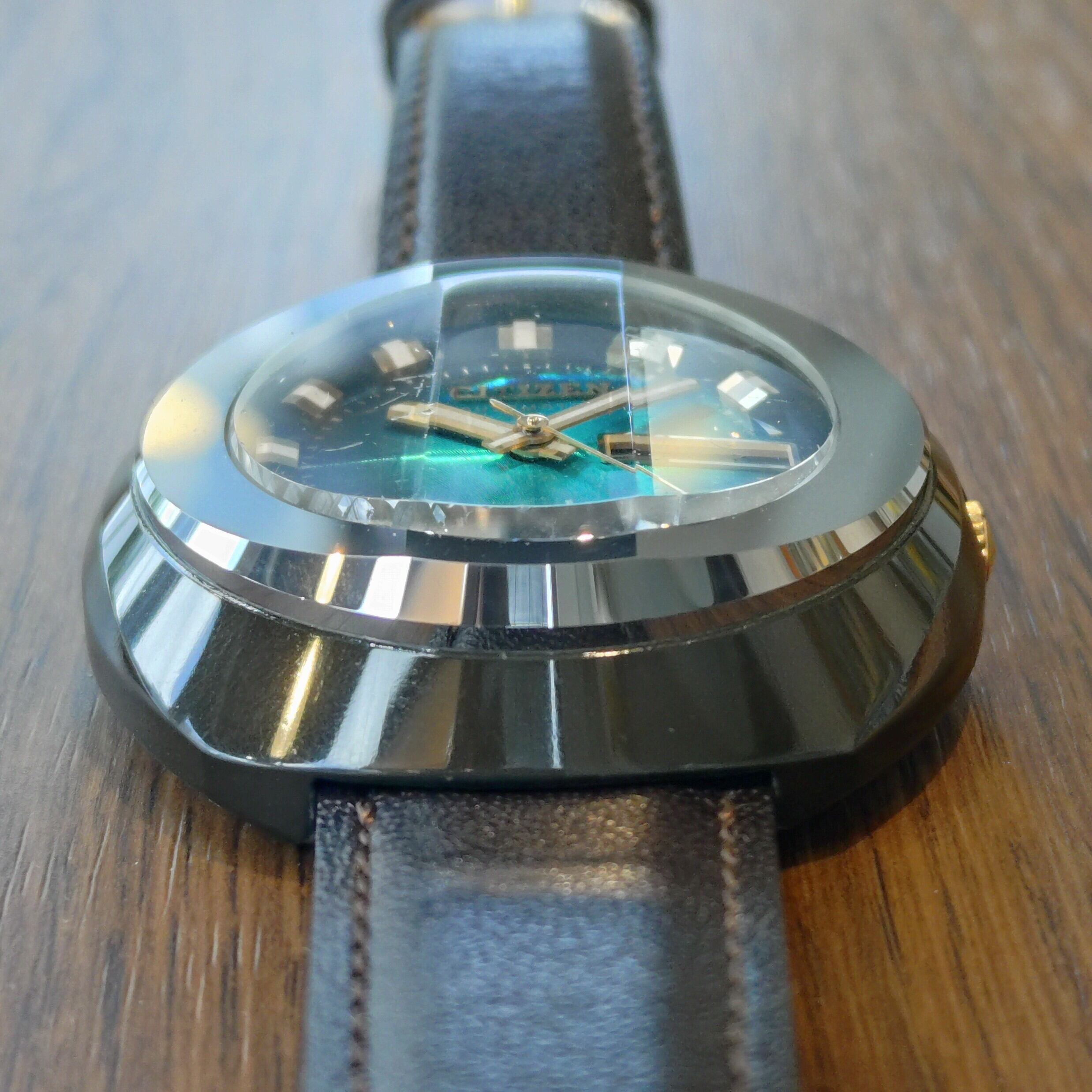 グリーンのグラデーションダイアルにクリスタルカットガラス。美しいビンテージウォッチです。