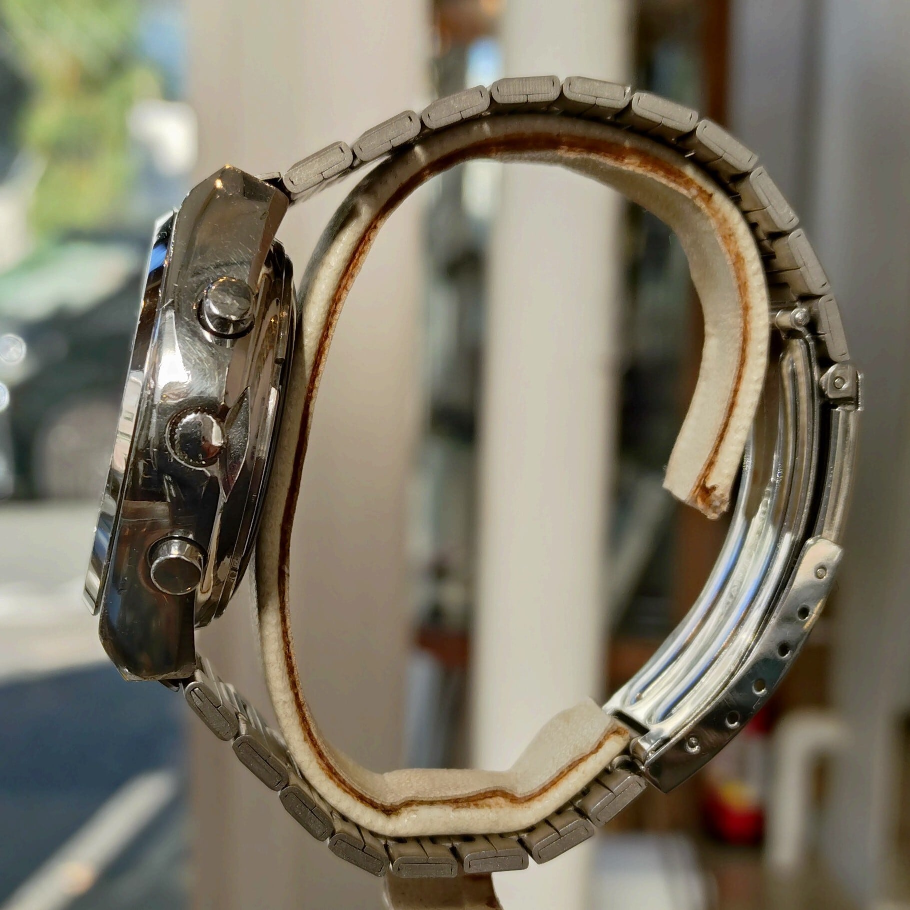 「時の探索者」という名前がついた、両面スケルトンのタイムソナー。珍しいビンテージウォッチです。