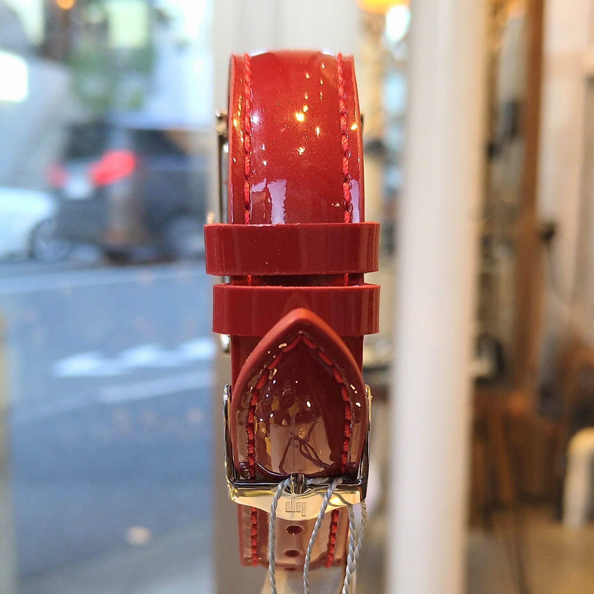 赤い秒針に、エナメル仕様のバンドが可愛いフランス時計です。